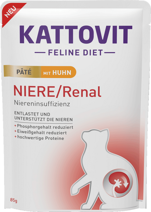 Nieru darbības atbalsts hroniskas nieru mazspējas gadījumā un oksalona veidošanās samazināšana. Kattovit Feline Diēta – KIDNEY/RENAL ir īpaši izstrādāta, lai nodrošinātu kaķiem samazinātu olbaltumvielu saturu, izmantojot augstas kvalitātes olbaltumvielas viegli sagremojamā sastāvā. Augsts olbaltumvielu līmenis var negatīvi ietekmēt nieres. Izšķirošais faktors ir olbaltumvielu saturs attiecībā pret enerģijas daudzumu. Kattovit KIERE/RENAL, atšķirībā no parastajiem ēdieniem, tikai aptuveni pusi enerģijas iegūst no olbaltumvielām. Bagātināšanai ar kālija citrātu ir urīnu sārmainoša iedarbība, tāpēc tā var novērst oksalāta kristālu veidošanos (oksalātu profilakse). Fosfora un nātrija līmenis ir samazināts.