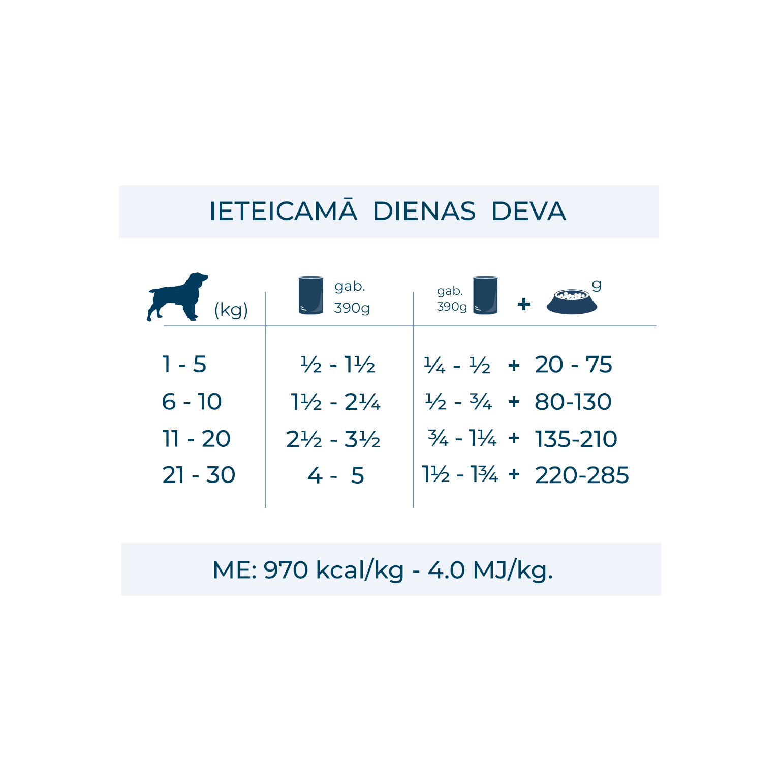 Sastāvs: zivis 85% (lasis 100%), kartupeļi, augu tauki un eļļas (Elaeis guineensis), minerālvielas, mannānoligosaharīdi (MOS), lielais diždadzis (Arctium lappa) 0,0308%, alveja (Aloe vera) 0,0232%, meža malva (Malva sylvestris) 0,0112%, upenes (Ribes nigrum), cigoriņu inulīns.