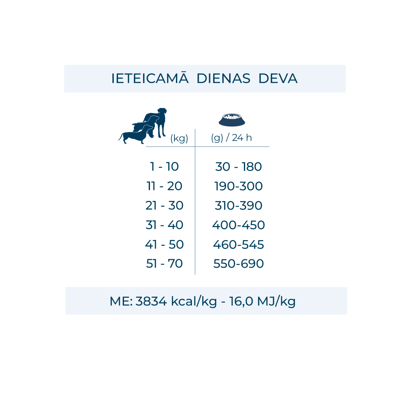 Analītiskie komponenti: mitrums 8,5%, kopproteīns 25%, koptauki 18%, koppelni 6,4%, kopšķiedra 3,6%, kalcijs 0,85%, fosfors 0,69%, omega-3 0,8%, EPA un DHA 0,6%, omega-6 3,0%, glikozamīns un hondroitīna sulfāts: 550 mg/kg. Metabolizējamā enerģija: 3834 kcal/kg – 16,0 MJ/kg.