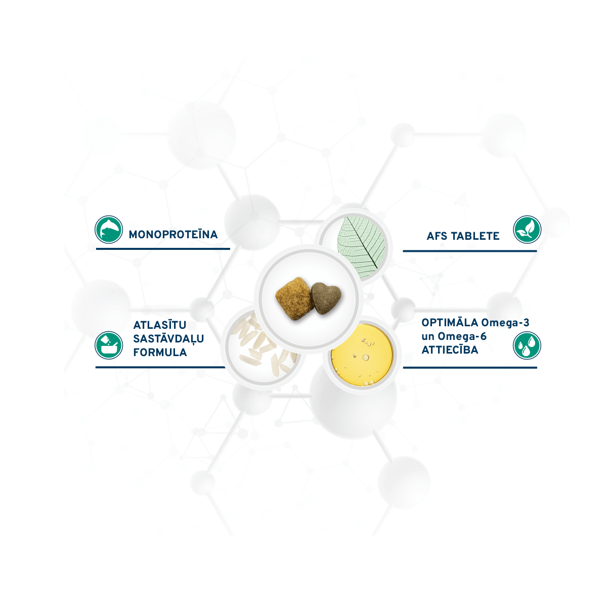 Sastāvā tikai viens alternatīvs dzīvnieku proteīna avots: zivs proteīns ar augstu bioloģisko vērtību un biopieejamību.