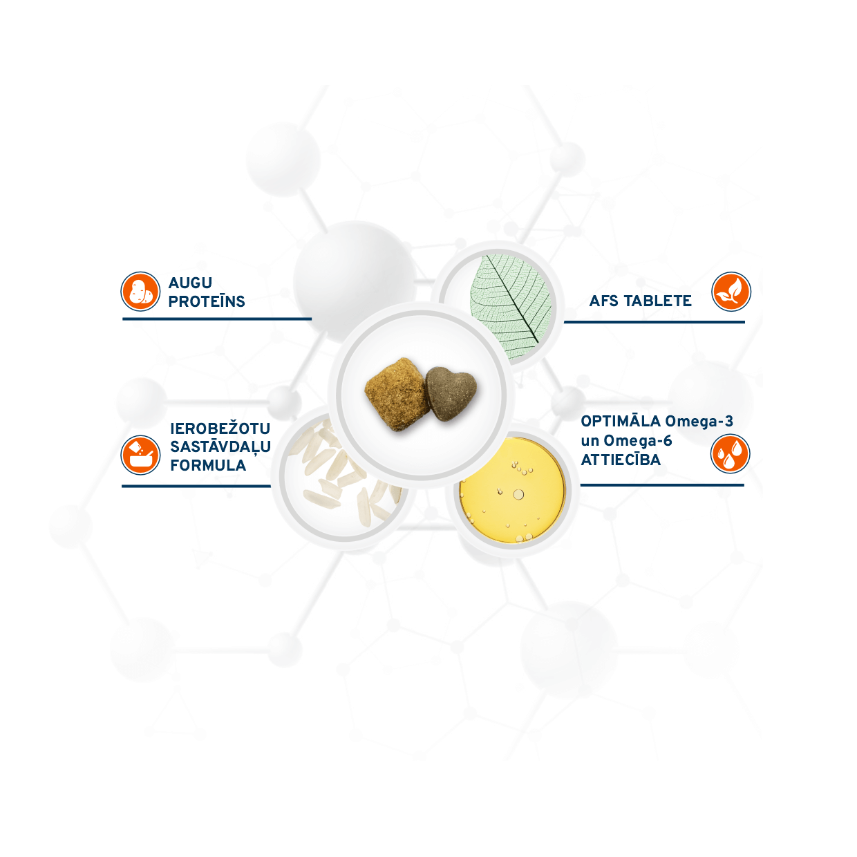 Sastāvs: slīpēti rīsi, zirņu ciete, vistas tauki, kartupeļu proteīns 10,4%, ((AFS tablete – 7% no barības): kartupeļu proteīns, minerālvielas, dzīvnieku proteīnu hidrolizāts 0,68%, pamauraga (Pilosella), augu pārstrādes produkti (Lespedeza spp. 0,0593%), žāvēts augļu mīkstums (Vaccinium macrocarpon 0,0376%), miltenes lapas)), biešu mīkstums, rīsu atsijas, žāvētas aļģes (Ascophyllum nodosum), zivju eļļa 2%, kukurūzas dīgļu jēleļļa, dzīvnieku proteīnu hidrolizāts 2%, minerālvielas, mannānoligosaharīdi (MOS), fruktooligosaharīdi (FOS), Yucca schidigera.
