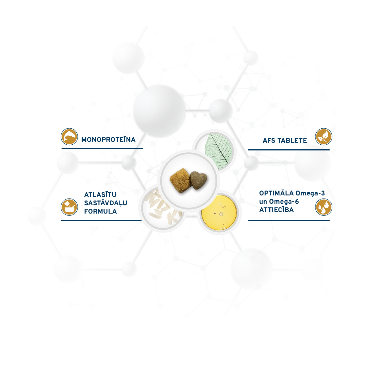 c) atlasīti olbaltumvielu un ogļhidrātu avoti (dzīvnieku proteīnu hidrolizāts, kaltēti anšovi, kartupeļu proteīns, rīsi ar augstu bioloģisko vērtību).