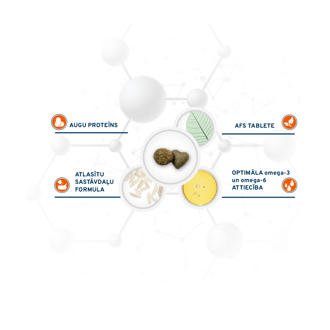 Sastāvs: slīpēti rīsi, eļļas un tauki (no tiem zivju eļļa 2%), dzīvnieku proteīnu hidrolizāts 10,7%, kukurūzas proteīns, (( AFS tabletes – 7% no barības): kartupeļu proteīns, minerālvielas, dzīvnieku proteīnu hidrolizāts, mauragas 0,0753%, augu pārstrādes produkti (Lespedeza spp.), svaigu augļu un dārzeņu pārstrādes produkti un līdzprodukti (Vaccinium macrocarpon 0,0376%)), dehidratizēta zivs 6%, kartupeļu proteīns, biešu mīkstums, minerālvielas, žāvētas aļģes (Ascophyllum nodosum), mannānoligosaharīdi (MOS), fruktooligosaharīdi (FOS), Yucca schidigera.