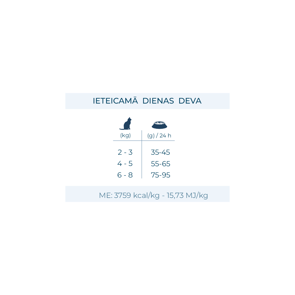 Analītiskie komponenti: kopproteīns 30%, koptauki 14,00%, kopšķiedra 2,50%, koppelni 8%, omega-3 0,80%, omega-6 2,40%. ME: 3759 kcal/kg - 15,73 MJ/kg