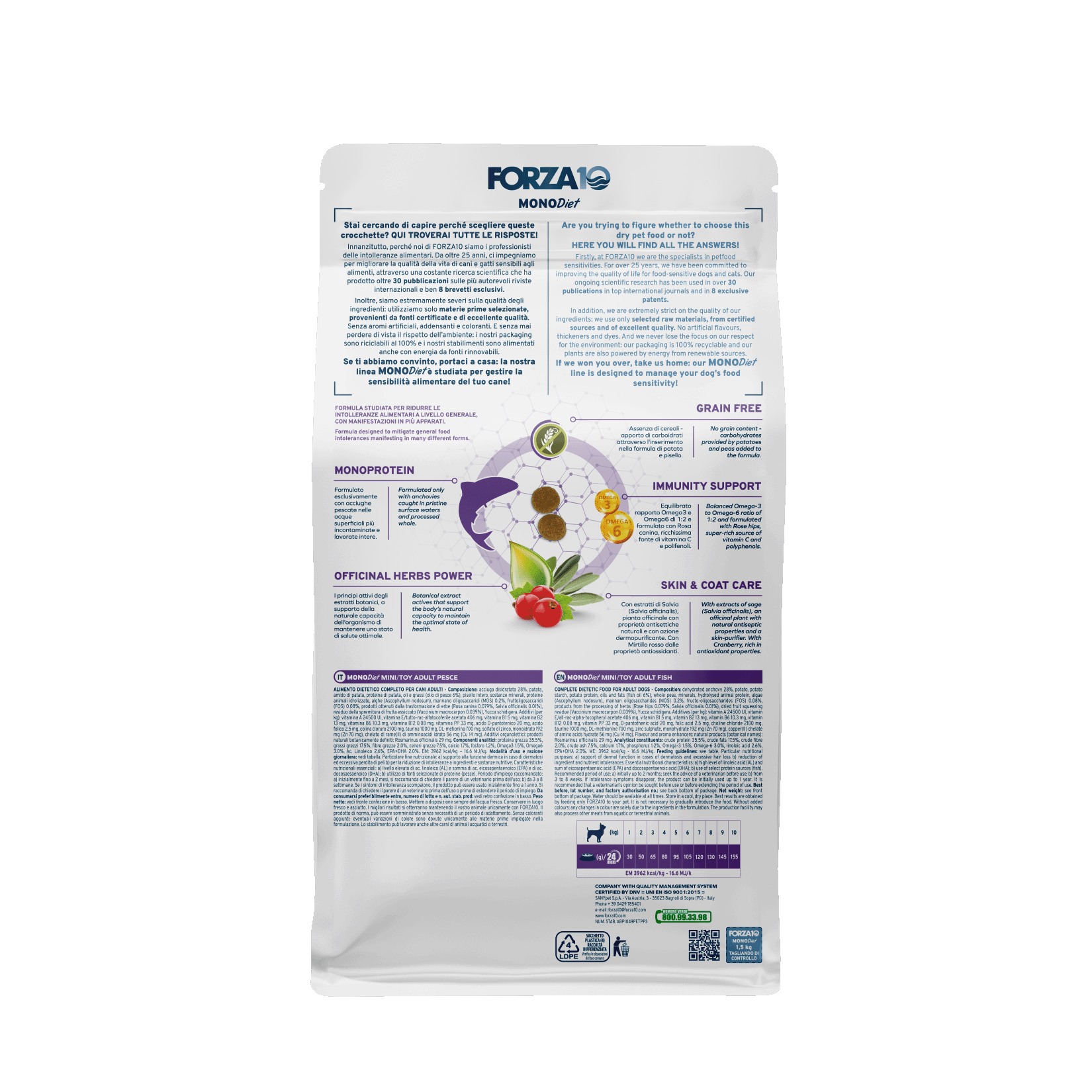 Sastāvs: dehidratizēti anšovi 28%, kartupeļi, kartupeļu ciete, kartupeļu proteīns, eļļas un taukvielas (zivju eļļa 6%), veseli zirņi, minerālvielas, dzīvnieku proteīnu hidrolizāts, aļģes (Ascophyllum nodosum), mannānoligosaharīdi (MOS) 0,2%, fruktooligosaharīdi (FOS) 0,08%, garšaugu pārstrādes produkti (mežrozīte 0,079%, Salvia officinalis 0.01%), žāvēts augļu mīkstums (Vaccinium macrocarpon 0,039%), Yucca schidigera.