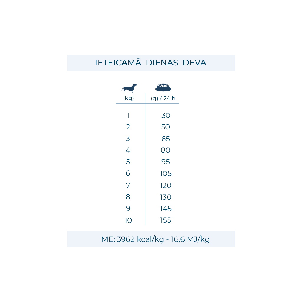 Analītiskie komponenti: kopproteīns 35,5%, koptauki 17,5%, kopšķiedra 2,0%, koppelni 7,5%, kalcijs 1,7%, fosfors 1,2%, omega-3 1,5%, omega-6 3,0%, linolskābe 2,6%, EPA+DHA 2,0%. ME: 3962 kcal/kg – 16,6 MJ/kg.