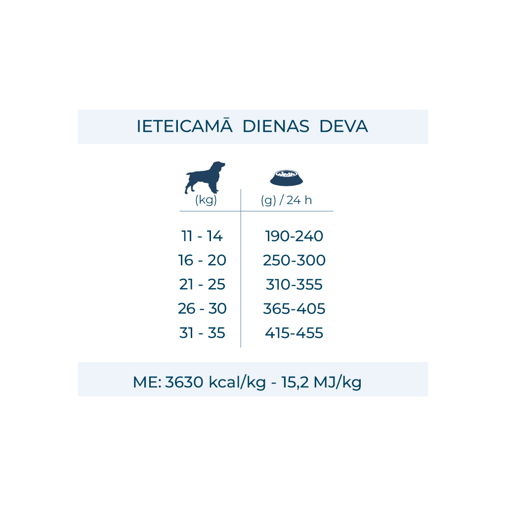 Analītiskie komponenti: kopproteīns 26,0%, koptauki 12,0%, kopšķiedra 2,9%, koppelni 7,9%, omega-3 0,7%, omega-6 2,2%. ME: 3630 kcal/kg - 15,2 MJ/kg.