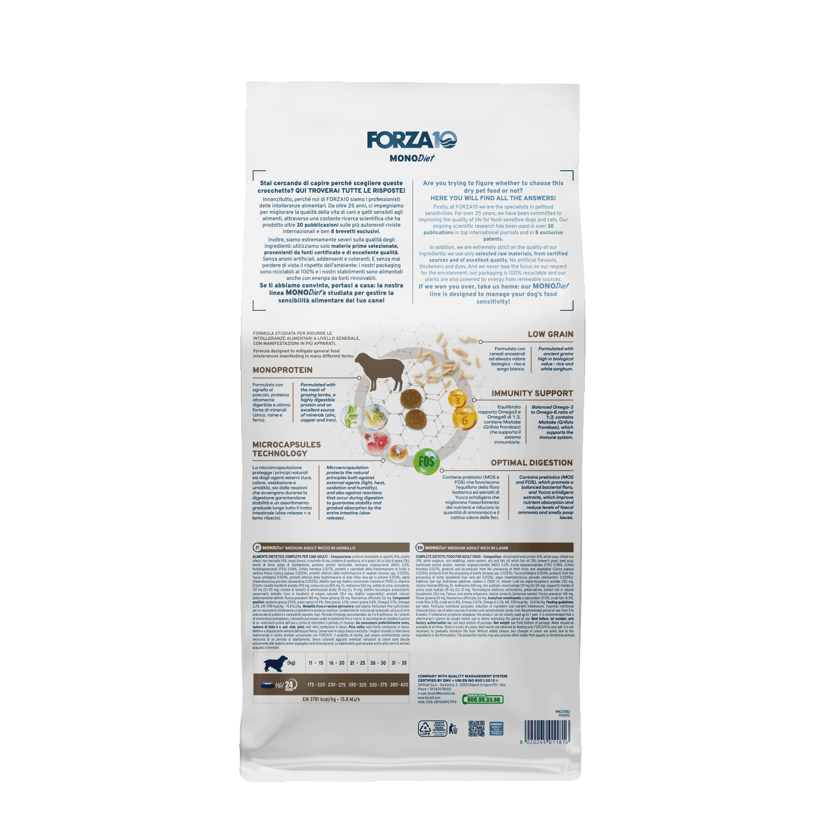 Sastāvs: dehidratizēts jēra proteīns 16%, veseli zirņi, slīpēti rīsi 15%, baltais sorgo, rīsu atsijas, kukurūzas proteīns, eļļas un tauki (no tiem zivju eļļa 2%), alus raugs, biešu mīkstums, dzīvnieku proteīnu hidrolizāts, mannānoligosaharīdi (MOS) 0,2%, fruktooligosaharīdi (FOS) 0,08%, Grifola frondosa 0,027%, svaigu augļu un dārzeņu pārstrādes produkti un līdzprodukti (Carica papaya 0,025%), augu pārstrādes produkti (Ananas spp. 0,025%), Yucca schidigera 0,024%, garšaugu pārstrādes produkti (alveja 0,013%), aļģes (Haematococcus pluvialis (astaksantīns 0,005%)).