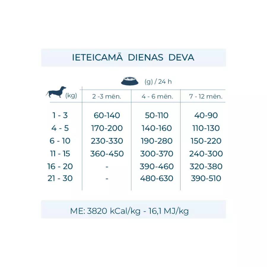 Analītiskie komponenti: kopproteīns 30%, koptauki 15%, kopšķiedra 2,3%, koppelni 7%, omega-3 + omega-6 3,3%. EPA + DHA: 3,6%. ME: 3859 kcal/kg - 16,15 MJ/kg.