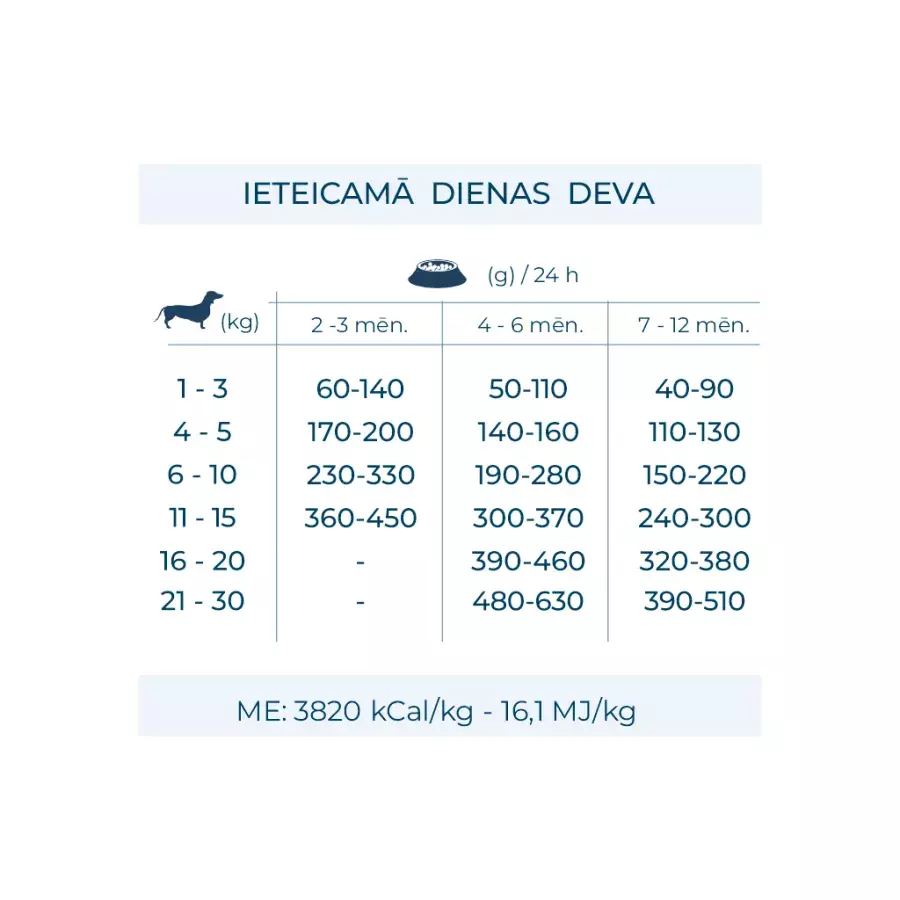 Analītiskie komponenti: kopproteīns 30%, koptauki 16%, kopšķiedra 2,5%, koppelni 7%, kalcijs 1,3%, fosfors 1,0%, omega-3 0,9%,omega-6 3,0%, EPA + DHA 1,4%. ME: 3852 kcal/kg - 16,1 MJ/kg.